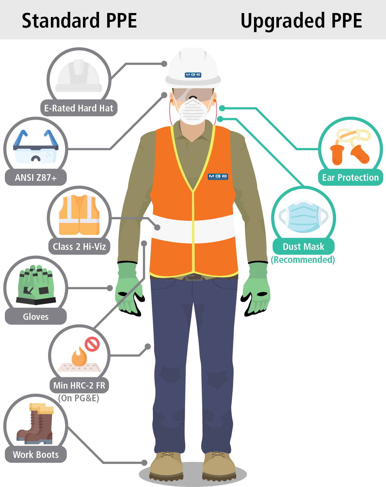 Standard PPE – High Viz Garment, Hard Hat, Z-87.1 Safety Glasses, Gloves, Pants, Work Boots