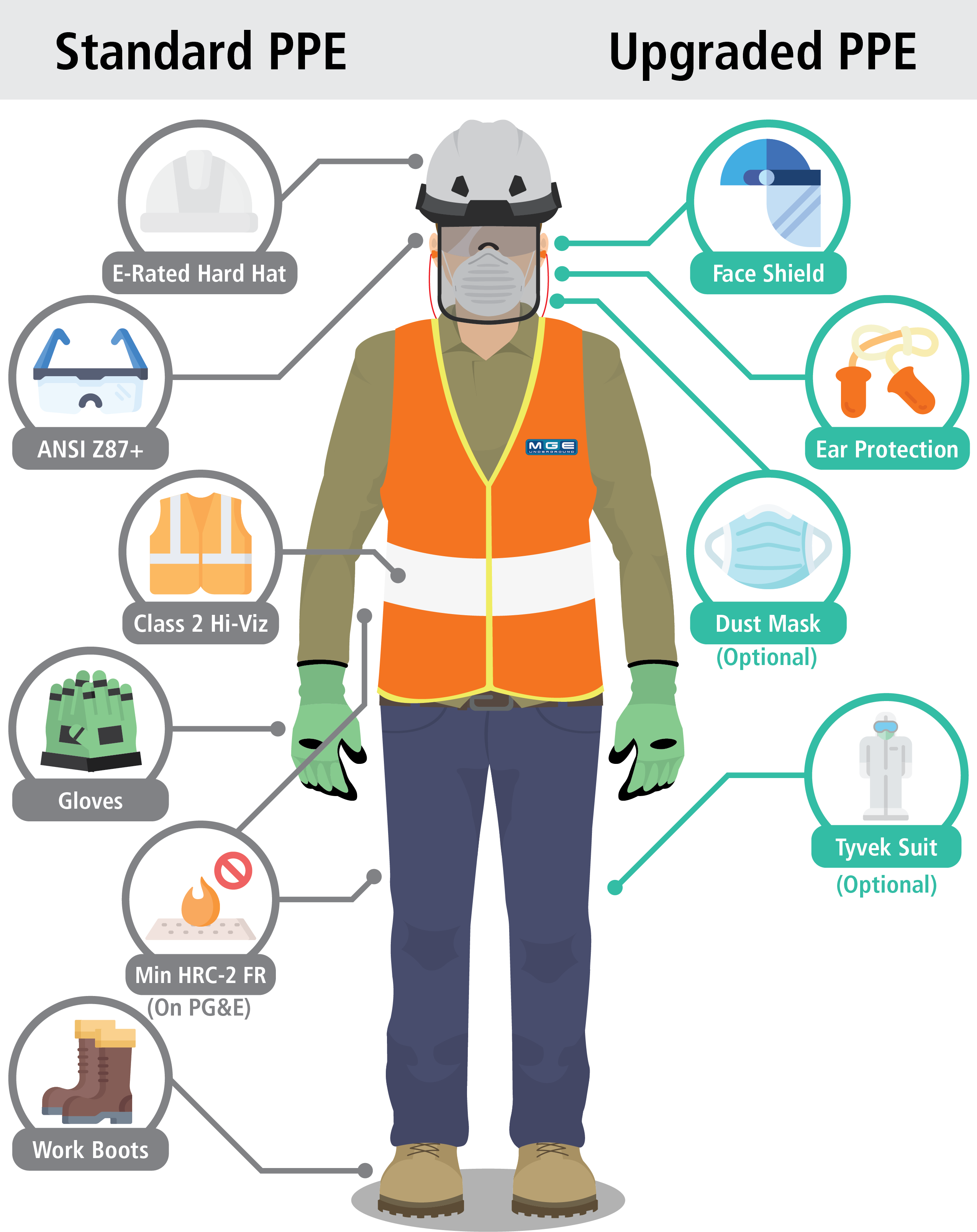 Standard PPE – High Viz garment, Hard Hat, Z-87.1 Safety Glasses, Gloves, Pants, Work Boots